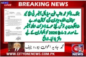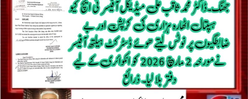 *ڈی ایچ او جھنگ نے سخت ایکشن لیتے ہوئے ڈاکٹر محمد ثاقب علی کو مورخہ 2 مارچ 2026 کو دوپہر 2 بجے اپنے دفتر طلب کر لیا ہے یہاں ان سے نان پریکٹس الاؤنس کی وصولی اور نجی پریکٹس کے حوالے سے باز پرس کی جائے گی*۔